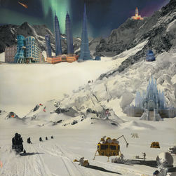 Series of three collages on canvases, composed of images printed on colour adhesive paper using inkjet printing. Each piece presents a visual narrative where black and white coexist with colour, creating symbolic contrasts and tensions. Animals, iconic architecture, and a central character —immersed within the scene— intertwine to invite the viewer to explore fragmented, illusory, and fantastic worlds.